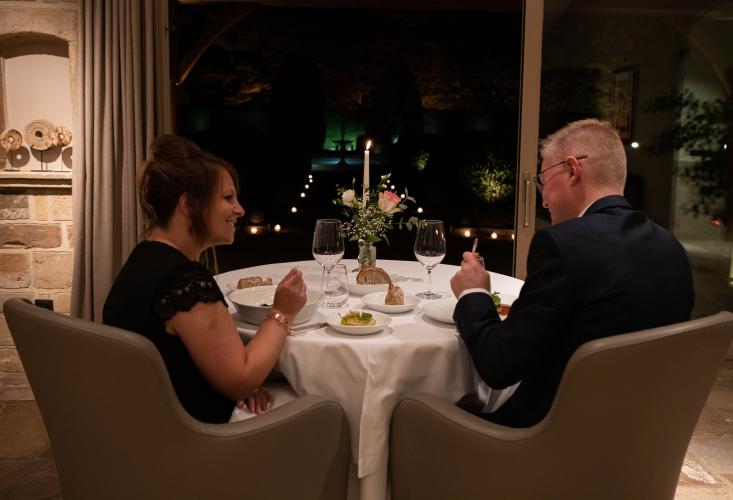 Le restaurant gastronomique étoilé au Guide Michelin, Table de Levernois, est dirigé par le Chef Philippe Augé. Il propose une cuisine passionnée aux saveurs traditionnelles de Bourgogne, mettant en avant les produits de saison issus de producteurs locaux et du potager de l'établissement. La salle du restaurant offre une vue apaisante sur le parc et ses arbres centenaires, créant une atmosphère propice à la dégustation.